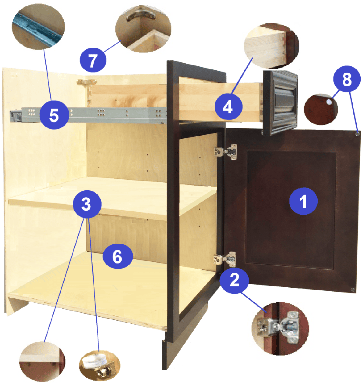 Our cabinetry is constructed entirely from maple wood, including doors, drawers, frames, moldings, corbels, posts and decorative elements. We use plywood for the main structure of the cabinet. We do not use any pressed woods or particle boards.
